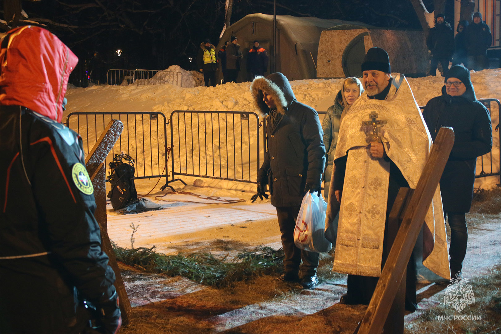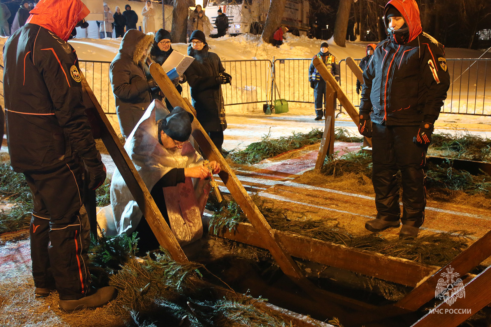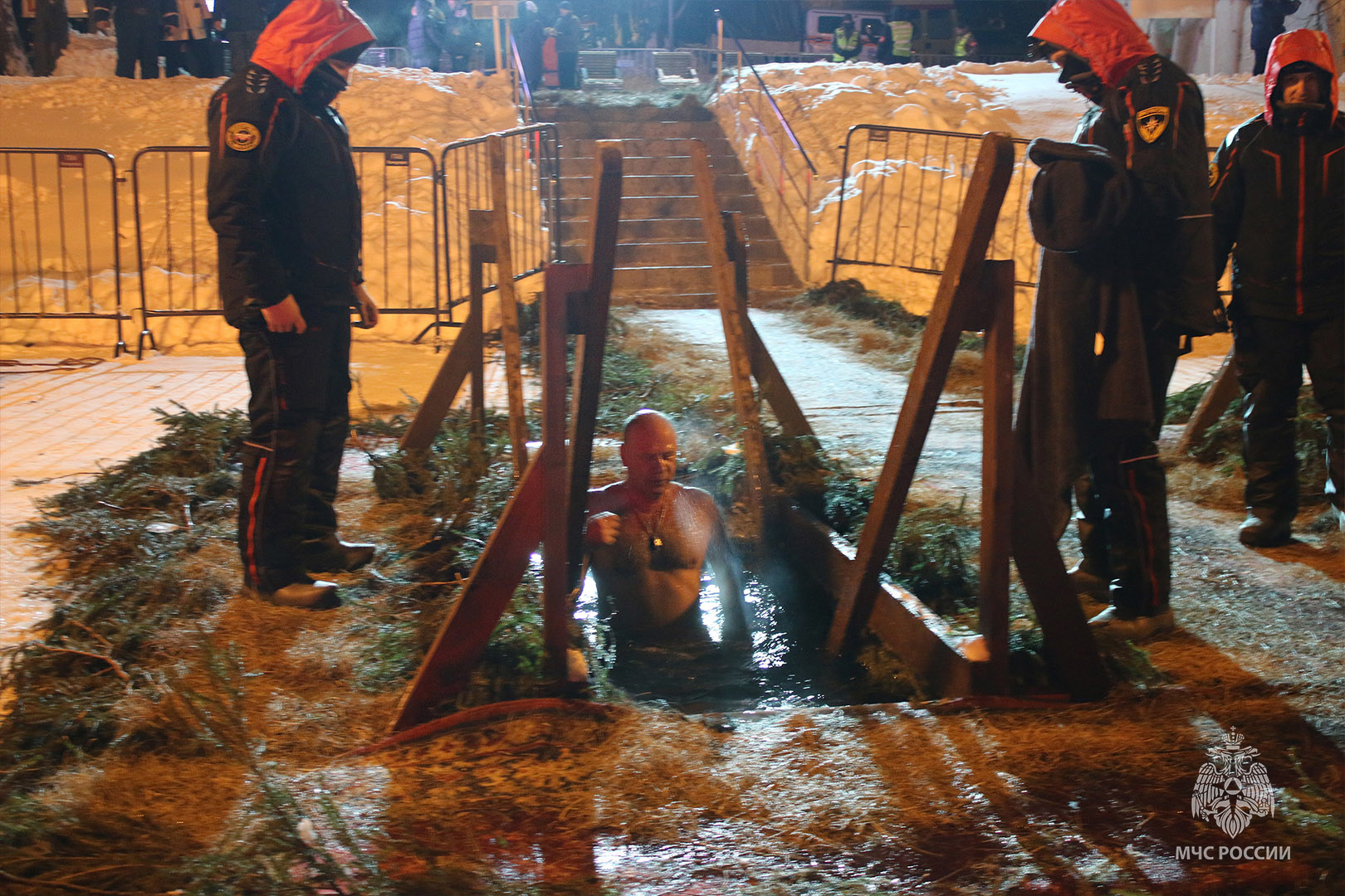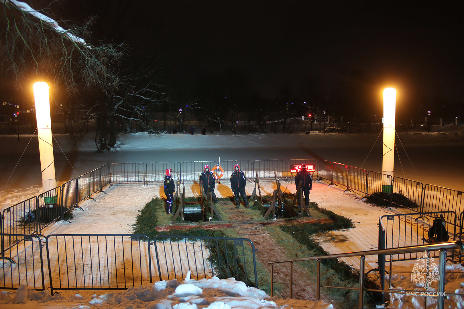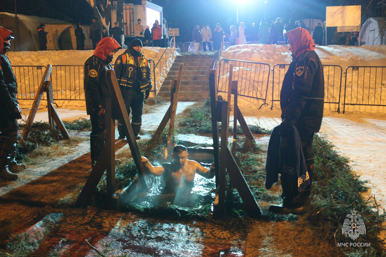 В МЧС заранее побеспокоились о безопасности граждан во время крещенских купаний. Так спасатели Центра «Лидер» подготовили проруби и осуществляли дежурство. Места купания оборудованы безопасными подходами и спусками к воде. Для комфортного проведения обряда были развернуты палатки для обогрева и переодевания, медицинский пункт, баня и световые башни.